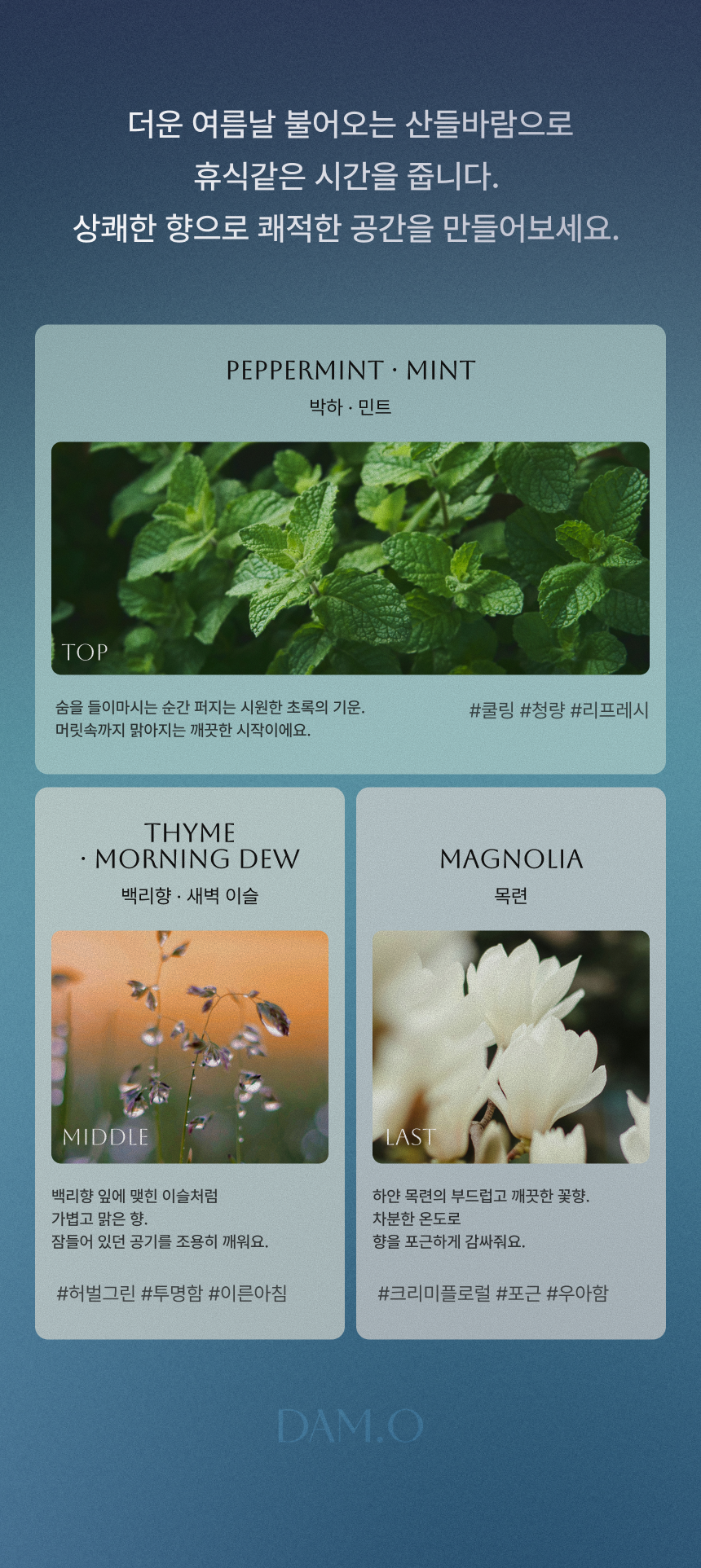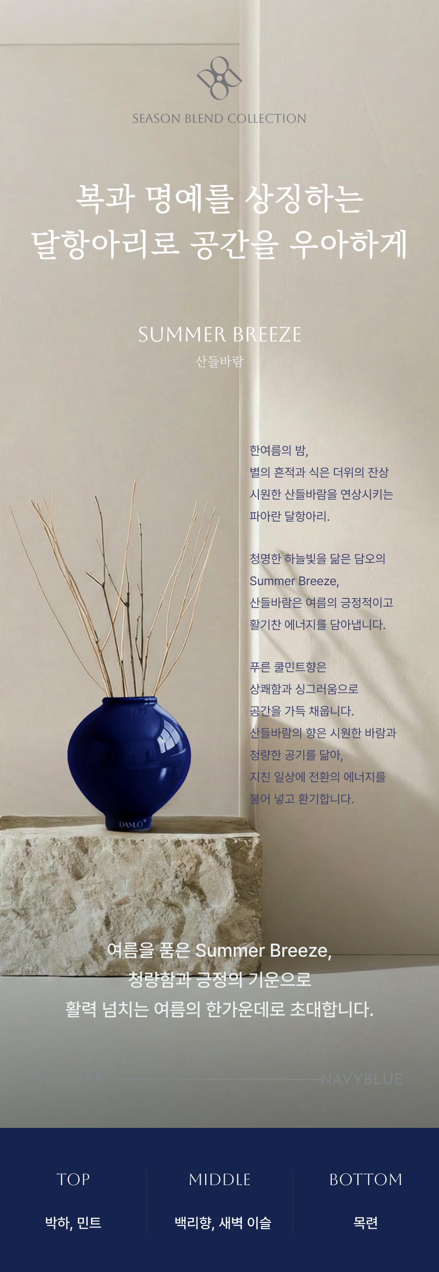 산들바람향은 공간에 청량한 숨을 불어넣는 담오의 여름 시그니처입니다.
