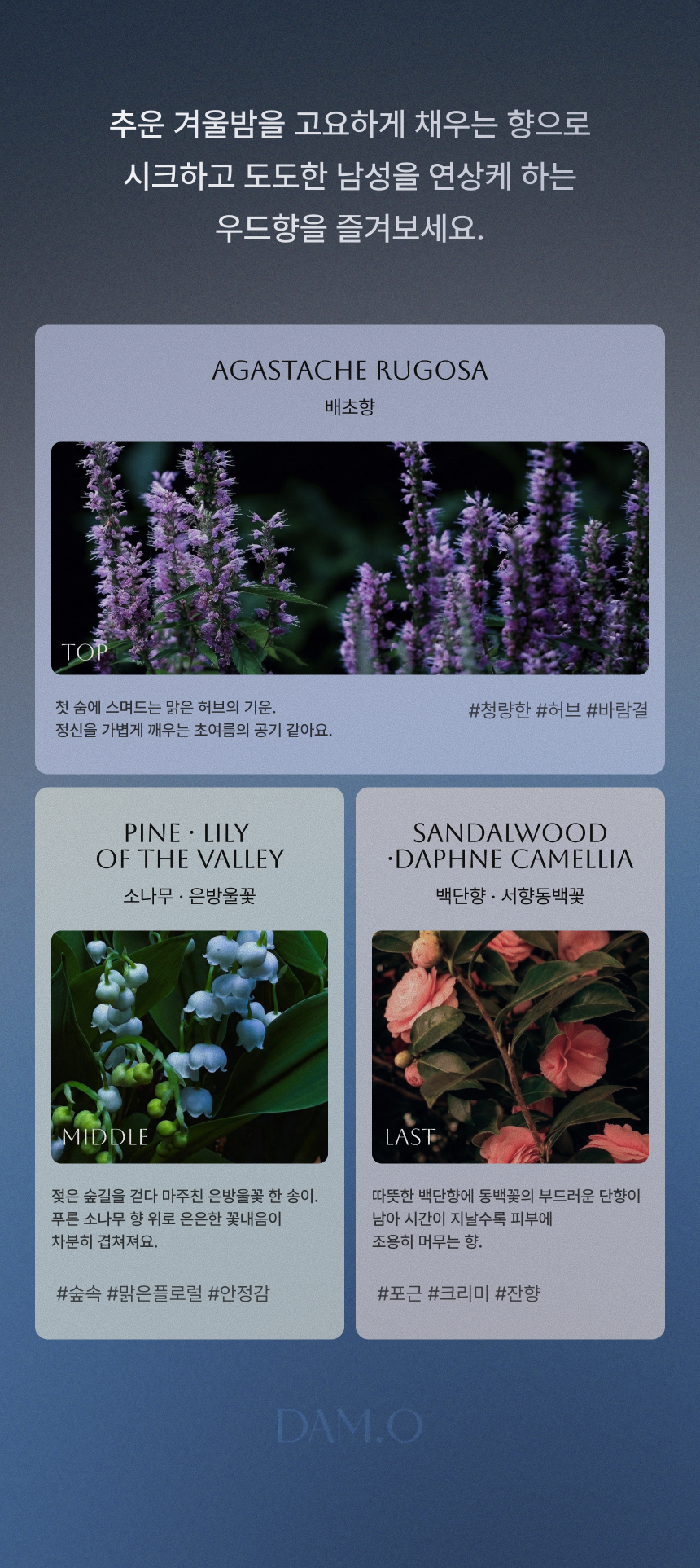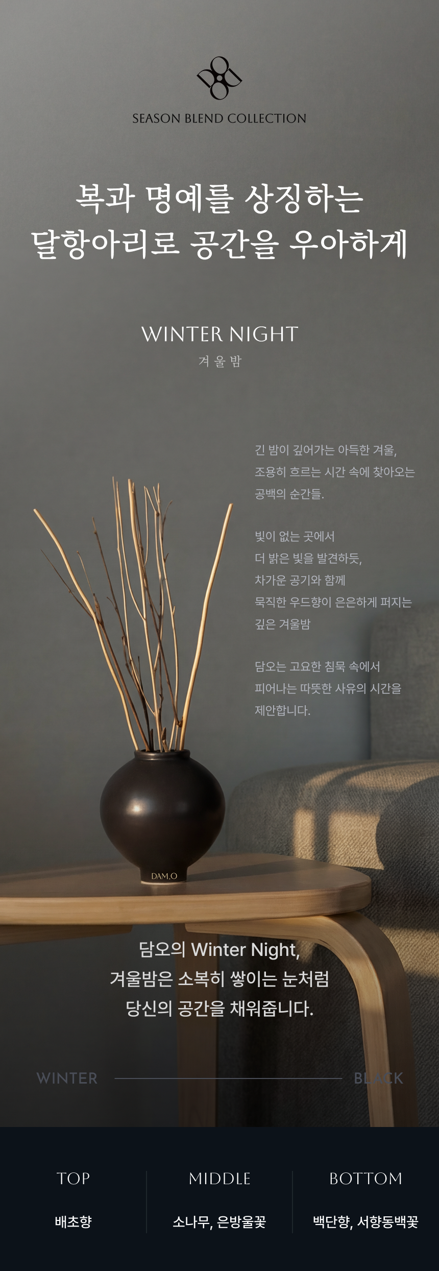 겨울밤은 담오가 표현하는 고요한 침묵 속에서 피어나는 따듯한 사유의 시간을 제안하는 향입니다.